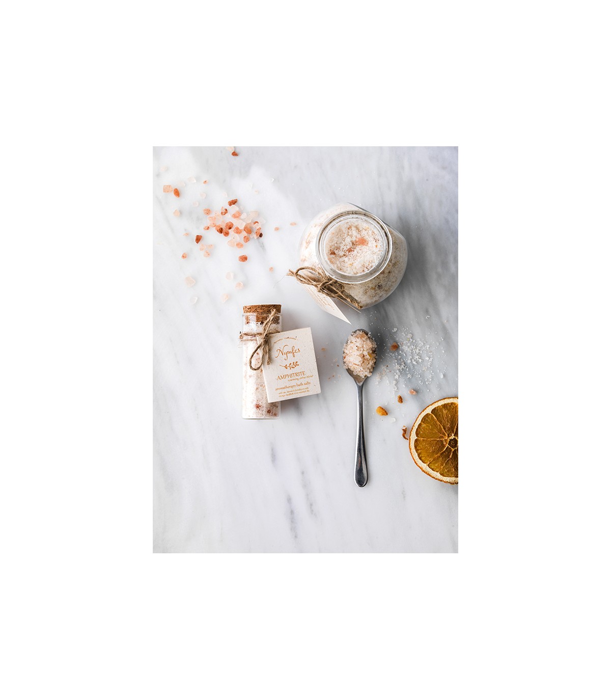 Create a warm atmosphere in your bath with the aromatherapy salts "Amphitrite". A blend of natural salts and essential oils that offer a unique experience of wellness and relaxation. Sea, epsom and Himalayan salts, rich in trace elements, soothe detoxify aching muscles while the sweet almond oil leaves your skin soft and moisturized. The warm, sweet aroma of orange, vanilla and clove essential oils offer you emotional balance and wellness.