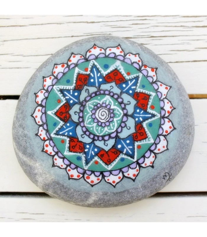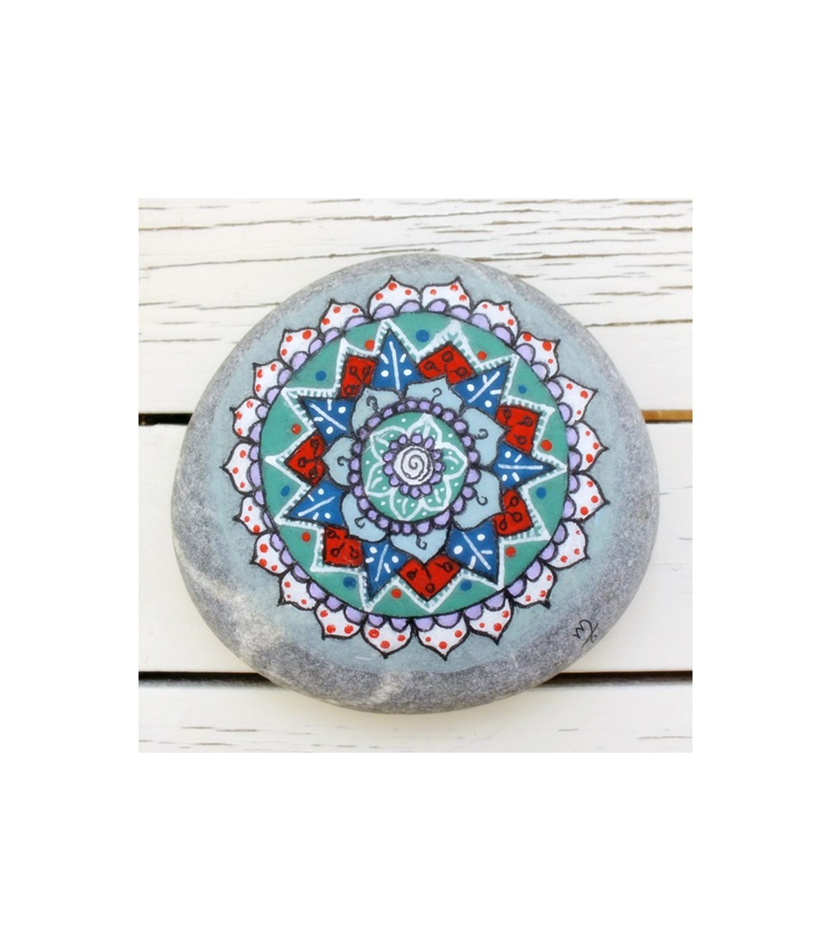 "Circle of love" - Dimensions: approx. 11 × 12 cm. Painted pebble with acrylic paints and white ink, lacquered to preserve drawing and colours.
