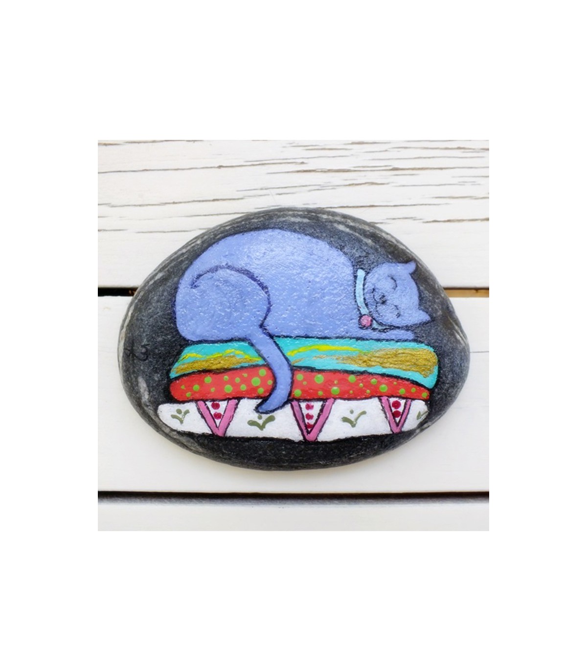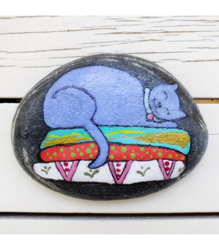 "Purple cat" - Approx. dimensions: 8 × 10 cm. Painted pebble with acrylic paints, lacquered to preserve drawing and colours.